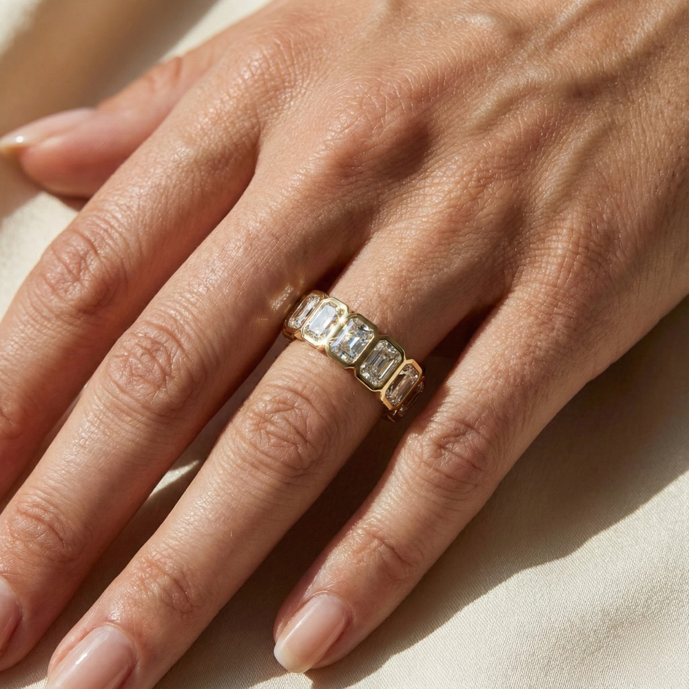 Choose Arohi – a bezel set radiant cut eternity band that combines modern brilliance, ethical luxury, and timeless elegance.