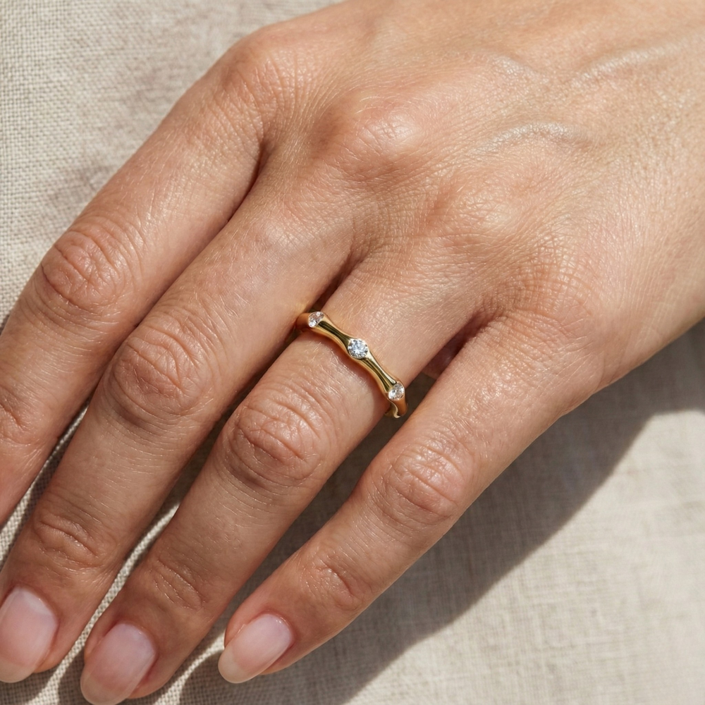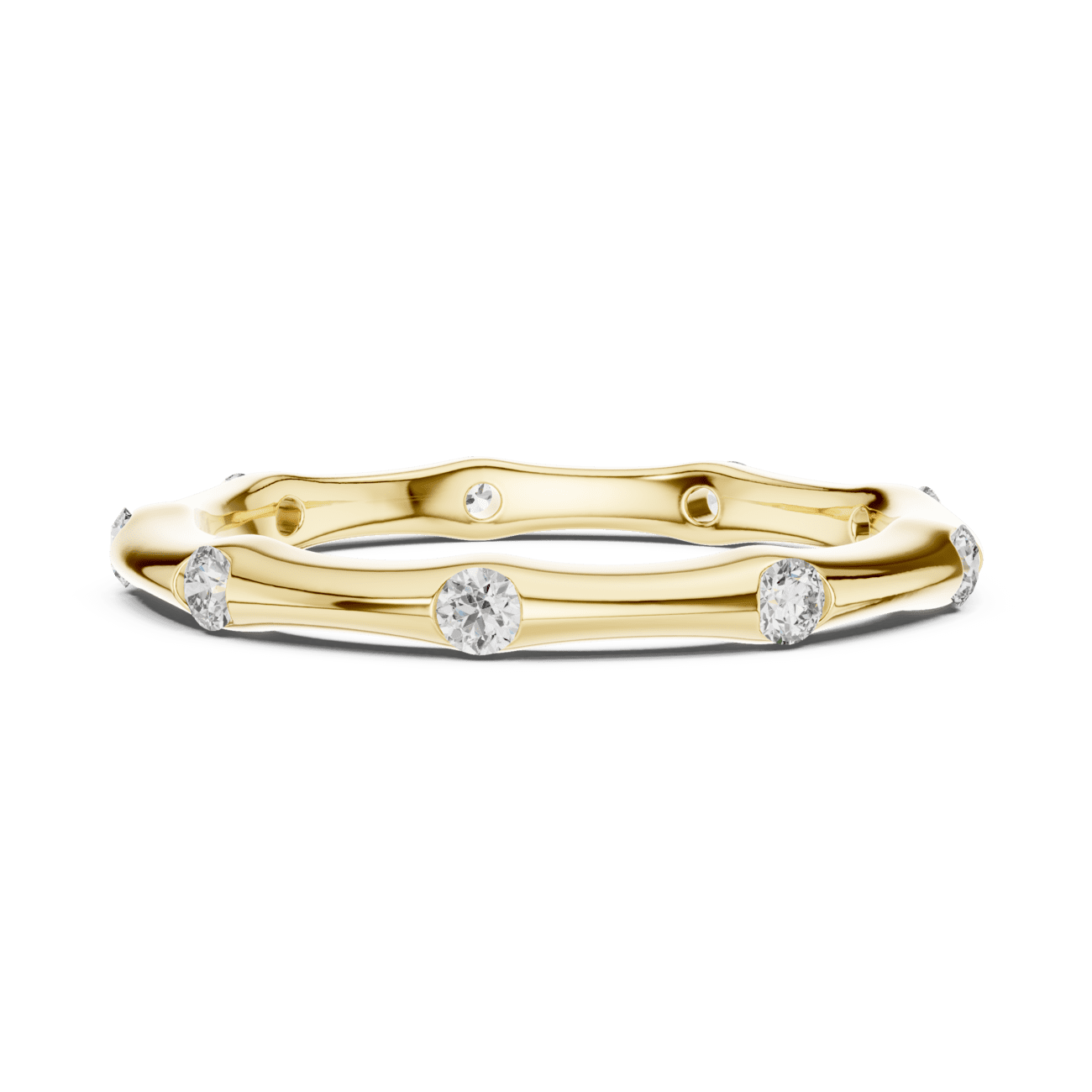 The Iris Bamboo Style Wedding Ring by Jewel Nests is a modern, nature-inspired design crafted in 14K solid gold. Featuring delicate round brilliant cut lab-grown diamond accents, this elegant band is perfect as a stackable wedding ring, anniversary band, or minimalist everyday piece. Designed for effortless layering, the Iris ring adds a touch of sparkle and sophistication to your bridal stack.