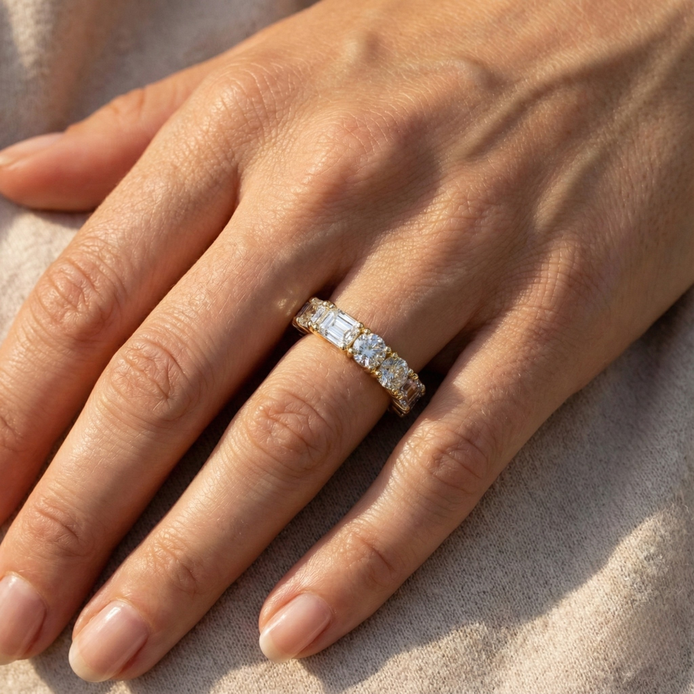 Choose Lavya – the mixed-cut lab-grown diamond eternity band that blends modern artistry, ethical craftsmanship, and everlasting elegance.
