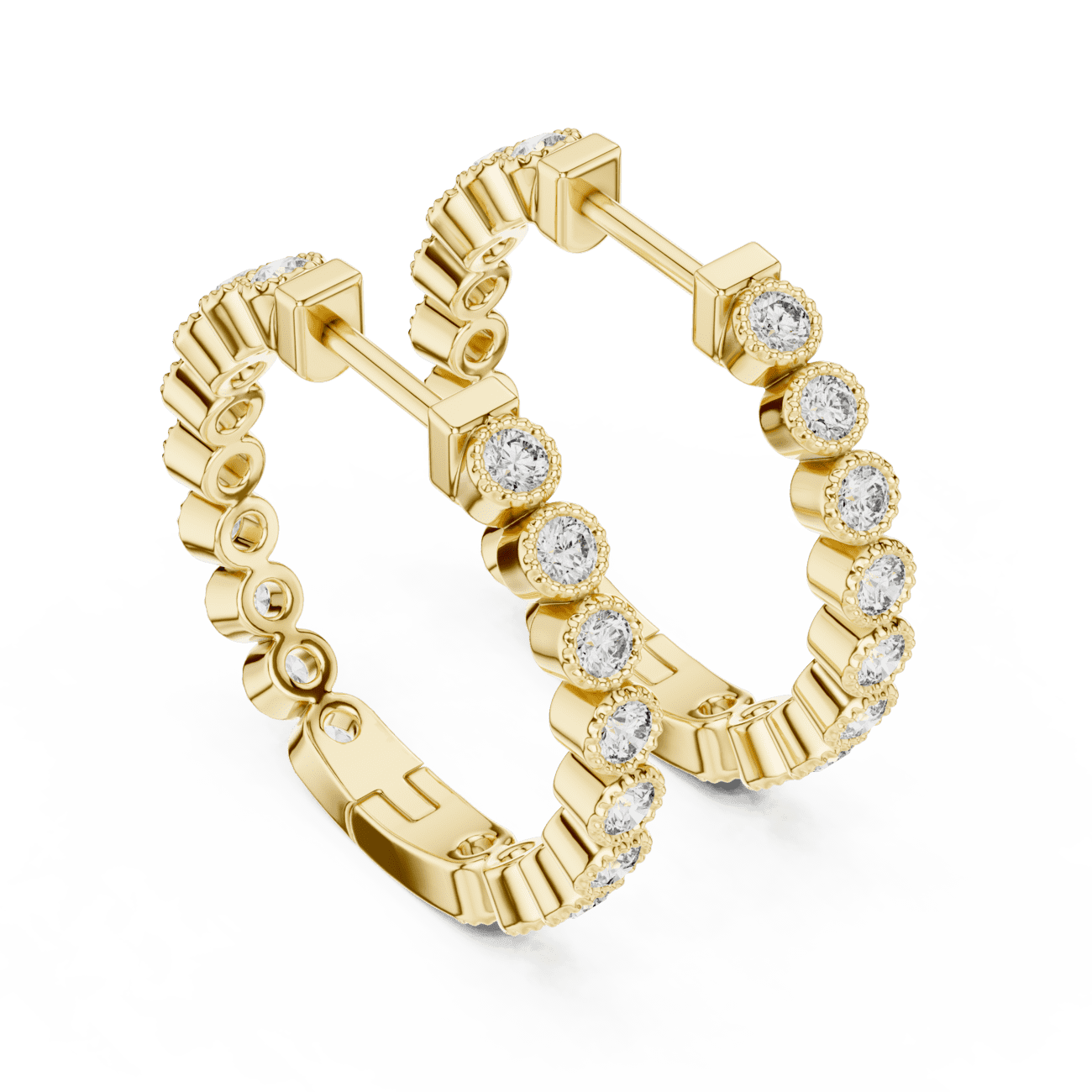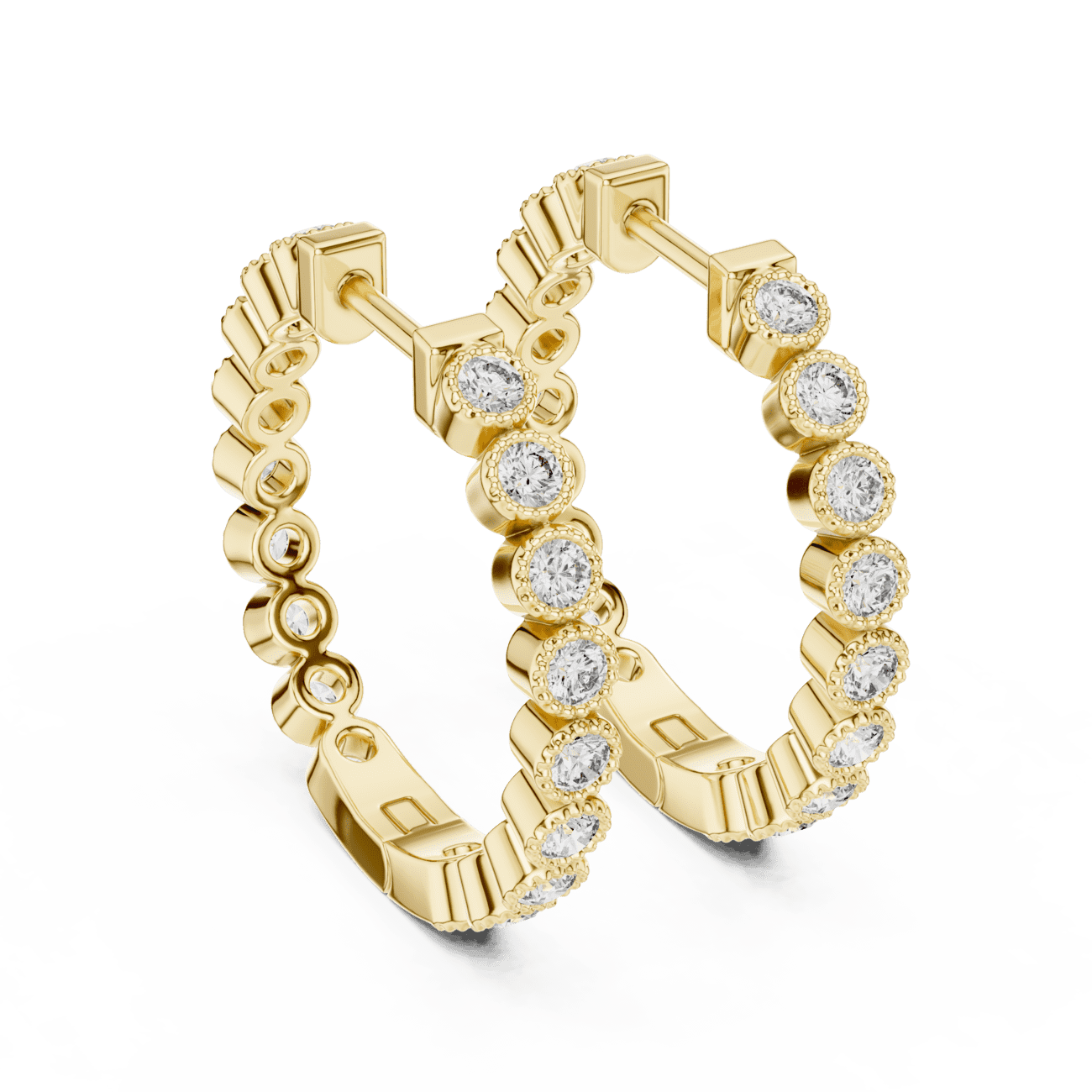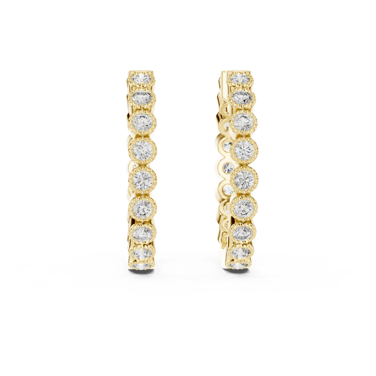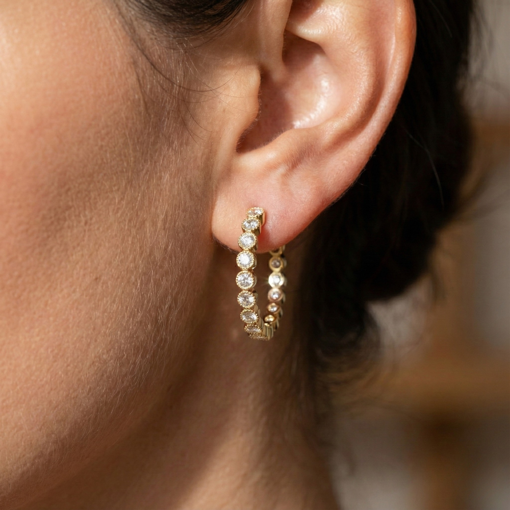 The prong‑set round cut lab diamonds are expertly aligned along the hoops to maximize light, brilliance, and fire, echoing the luxurious feel of designer fine jewelry at an accessible online price. Available in your choice of 14K or 18K solid Yellow Gold, White Gold, or Rose Gold, Ophelia is designed for all‑day comfort and timeless elegance, whether worn alone or stacked with other earrings.
