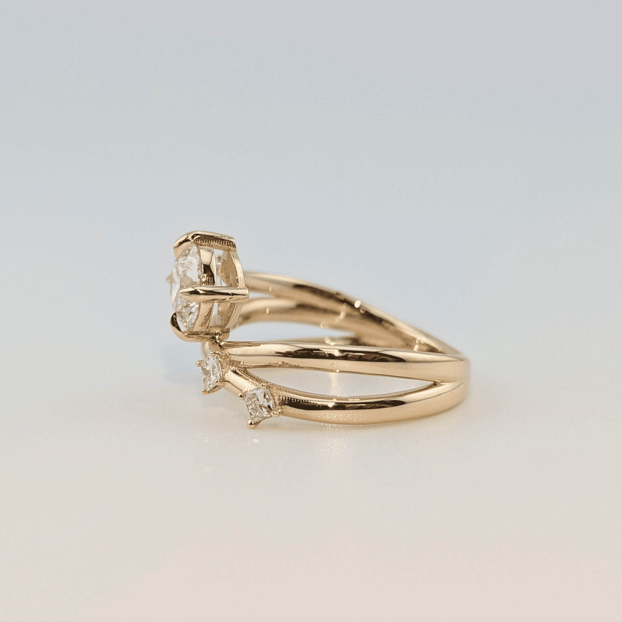 Radiate elegance with the Phoenix Brilliance Engagement Ring from Jewel Nests — a true symbol of modern sophistication. This lab grown diamond engagement ring features a brilliant round cut center diamond gracefully set on a unique gold spiral band, beautifully accented with princess-cut side diamonds. Handcrafted in 14K or 18K solid yellow, white, or rose gold, this design blends artistic craftsmanship with sustainable luxury.