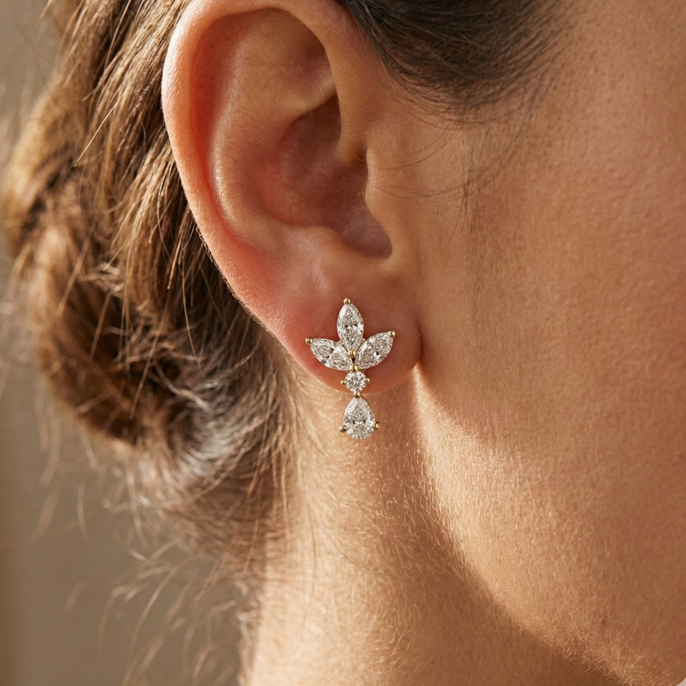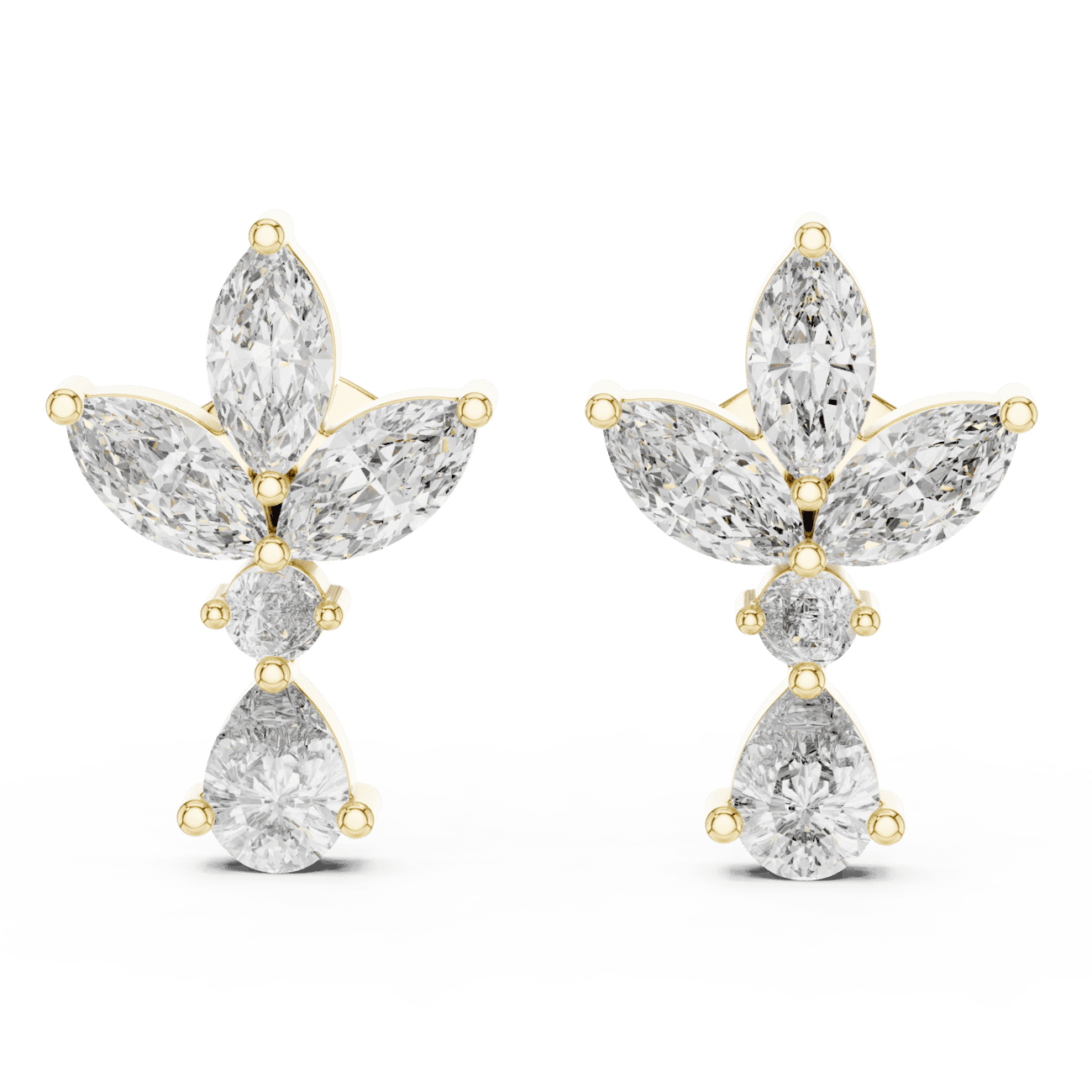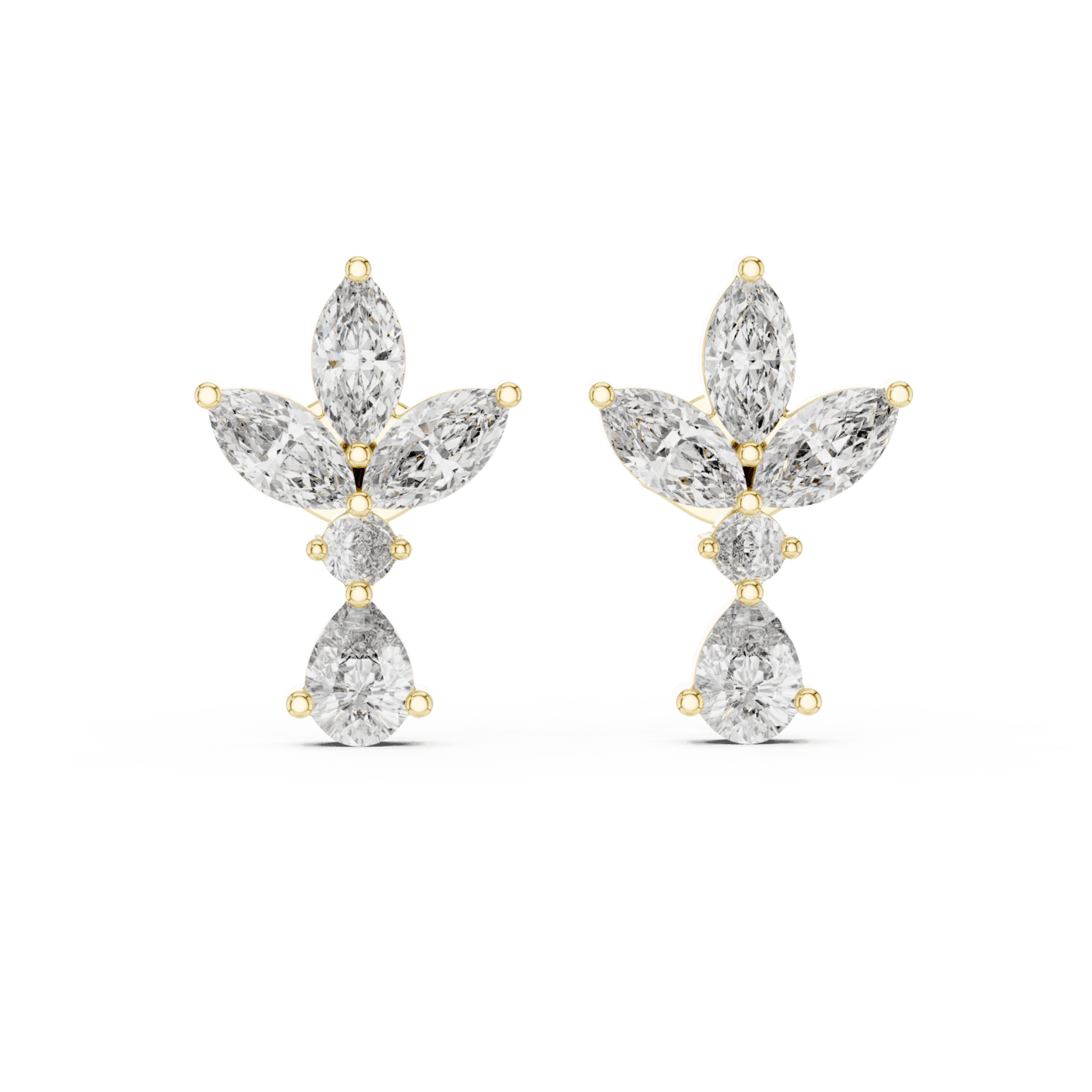 Experience timeless sophistication with Simiena by Jewelnests – a pair of mixed-cut lab grown diamond earrings featuring an exquisite blend of marquise, round, and pear cut diamonds. Expertly set in solid 14K gold, these sustainable diamond earrings deliver a dazzling, multidimensional sparkle that exudes elegance from every angle.
